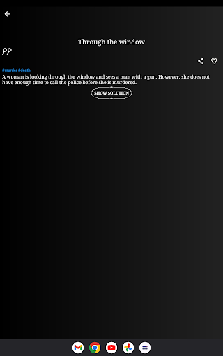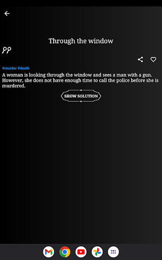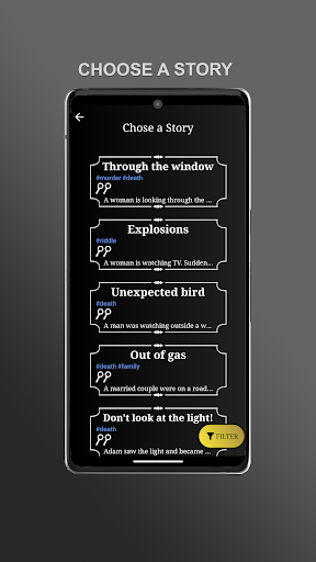The detective(s) must ask questions to solve the corresponding Story which the storyteller must answer with "yes", "no" or "I don't know".