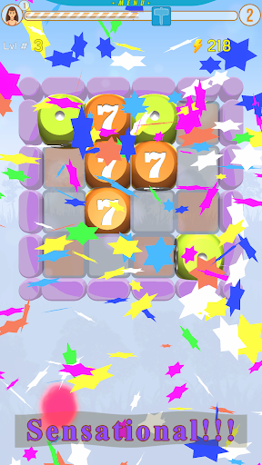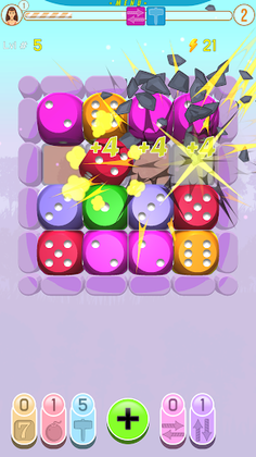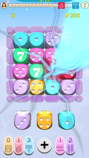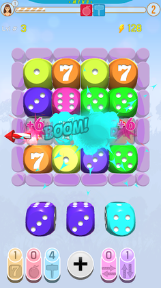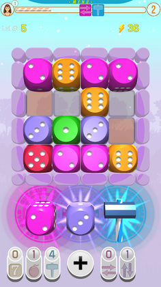 When in trouble player can use a booster: 1. Mighty Hammer - strike and destroy any dice with direct lightning. 2. Bomb - clear 3x3 area. 3. Add a Seven that we can move inside the board. 4. Rockets attack - clear line or column from all dices. At the start, the player receives an initial amount of boosters, and players wins additional boosters by playing more and leveling up, by merging m more dice. The player can choose their avatar and nickname by clicking on the avatar icon.