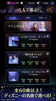 This music game features numerous characters from popular Disney titles such as "Mickey & Friends," "Aladdin," "Frozen," and "Beauty and the Beast." It allows anyone to effortlessly enjoy well-known Disney songs and popular tunes. Get into the groove and enjoy the game while riding on the rhythm of the music.