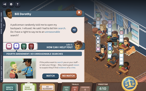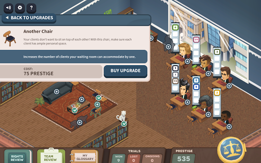 You'll enhance and grow your law firm as you win more cases, which enables you to add additional lawyers, an upgraded waiting room for impatient clients, a coffee machine for additional energy, and even ads to attract new clients to your firm. Ultimately, your goal is to protect the constitutional rights of your clients and make your firm the most successful one in town!