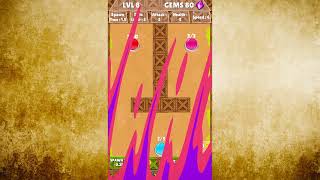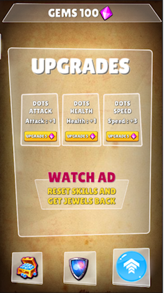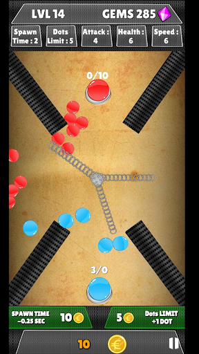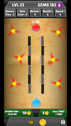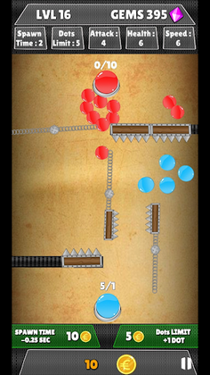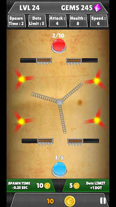 In this dots game you can increase the spawn time and the dots attack limit for the respective level. However, each upgrade reduces the number of Gems you win at the end of the game!