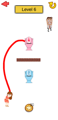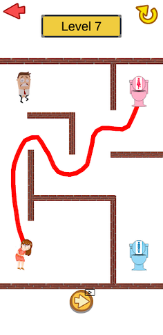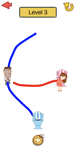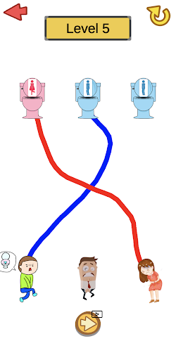 You need to help characters find their way to toilet, draw a line between the characters and their corresponding toilets, and avoid them from bumping into each other. If they collide, they will be dizzy and the game will fail.