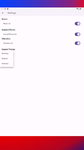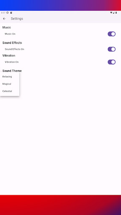 Default is Relaxing but try the Magical and Celestial sound themes too for interesting background music and sounds.