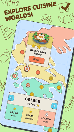 Embark on a journey of delicious food, travel, cats, and cooking by progressing through different levels and meeting new cats in every realm. Use hints provided by the game to develop your culinary skills. All dishes are real, so prepare to expand your cooking palette with wonder dishes!