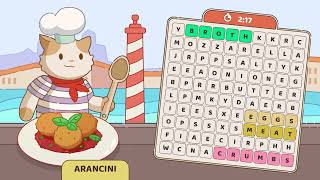 Join the adorable cooking cat in Food Words: Cooking Cat Puzzle, a relaxing word game with tasty recipes and challenging puzzles.