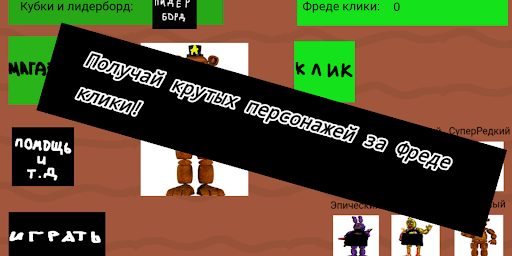 В этой игре ты можешь купить персонажей за Фреде клики которые будут приносить тебе большее количество Фреде кликов и играть в мини-игры которые будут приносить кубки!