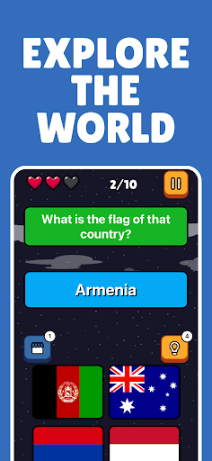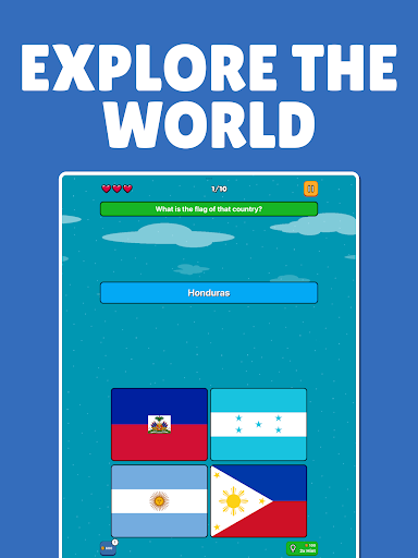 Dive into a visually captivating experience as you examine each flag in detail. From vibrant colors and intricate patterns to unique symbols and emblems, every flag is a work of art with its own story to tell. The high-resolution images allow you to appreciate the finer details of each flag, enhancing your learning and enjoyment. The game's stunning visuals are designed to provide an immersive experience that will make you feel like you're traveling the world from the comfort of your device.