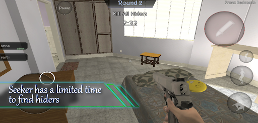 Seeker has a gun he shoot at hider when he finds him. Whereas hider has a knife he can come from the back, stab the seeker and win the round. Seeker has limited time to find all hiders.