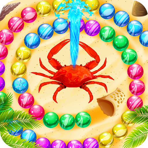 There are several colored balls in a chain are coming towards the big crab.
