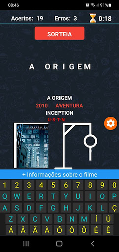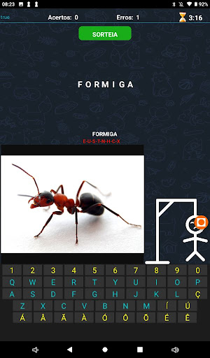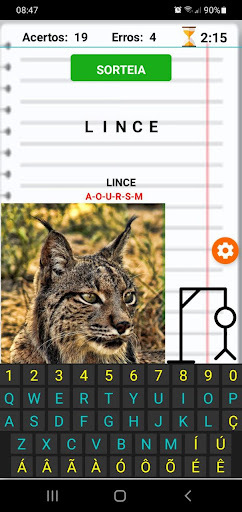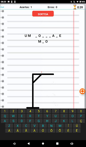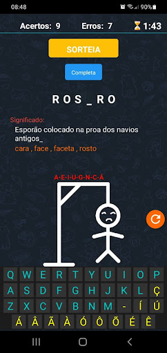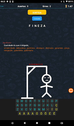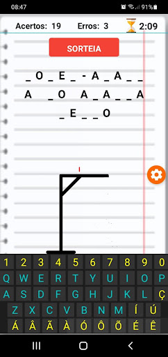O jogo lhe dará a opção de escolher vogais e consoantes para tentar adivinhar qual palavra está escondida. Para cada erro que você cometer, a figura de um homem de pau será formada: primeiro a forca, depois a cabeça, o corpo e, finalmente, os braços e pernas.