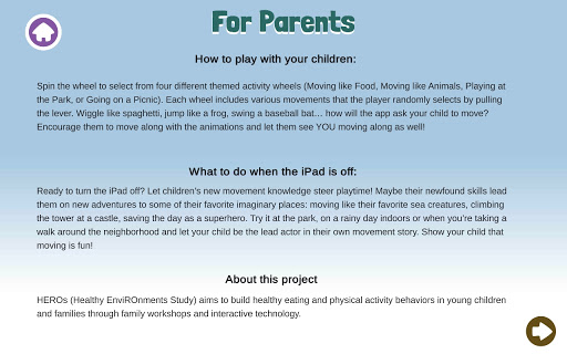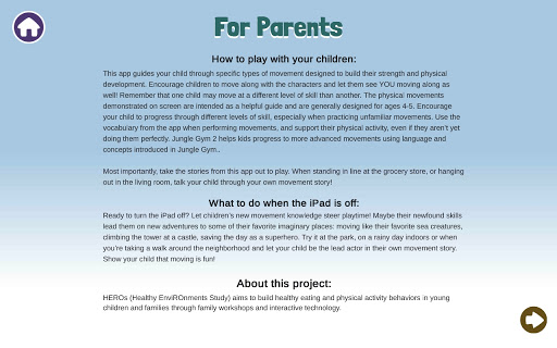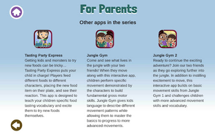 When children move along with this interactive app, they perform specific movements to build specific gross motor skills. Jungle Gym gives kids language to describe different movement patterns while allowing them to master the basics in preparation for more advanced movements.