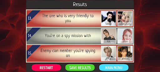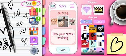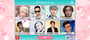 Our dating doors game features 12 exclusive editions ("Around the world", "Crime", "Horror", "Idol life", "Party", "Summer vacation", "University", "Vampires", "Wedding", "Winter vacation", "Marry me!", "Rural life") and 26 K-Pop groups (BTS, Stray Kids, NCT, Ateez, Monsta X, TXT, aespa, BLACKPINK, ITZY, (G)I-DLE, EVERGLOW, EXO, GOT7, MAMAMOO, Red Velvet, SHINee, TWICE, AB6IX, BIGBANG, iKON, Winner, STAYC, NewJeans, IVE, Enhypen, Astro). Choose the pictures you like the most to get answers, enjoy the music and design perfectly fitting the vibe of each edition and have fun on dates with your favorite idols!
