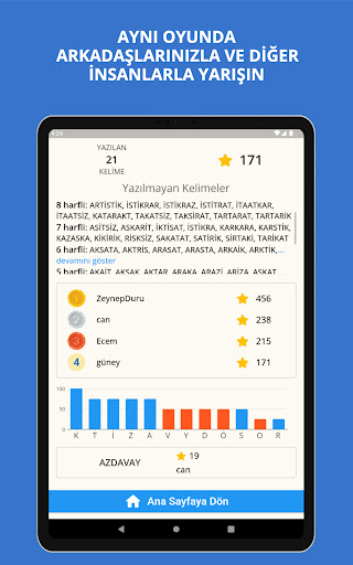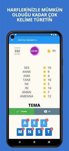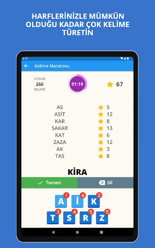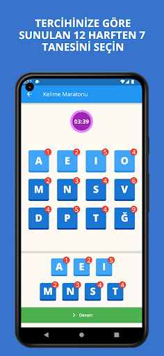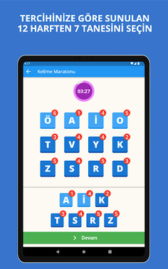 You can play alone or with other players. Each game lasts 4 minutes and you choose 7 of the 12 random letters presented to you in the first stage according to your preference. Do not forget to pay attention to the points that the letter you choose here will earn you. In the second stage, try to produce the maximum number of words with the 7 letters you have.