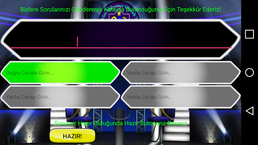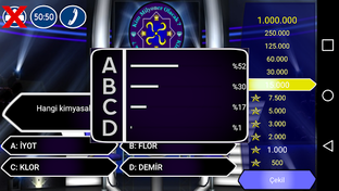 Milyonlar kazanıp Milyoner olabilir misin? Bilgin Milyonları kazanmaya yetecek mi? Tüm soruları doğru cevaplayıp beklenen Milyoner sen olabilecek misin? EBB Software Development'tan yepyeni bir bilgi yarışması sizlerle! Binlerce soru ile kendinizi sınayın ve Milyoner olun!