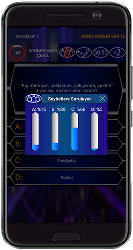 Seyirci Joker Hakkı: Sorunuzu seyircilere sorarak onlardan yardım almanızı sağlar, genelde çoğunluk doğru cevap verir.