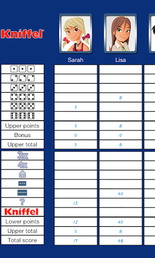 Only Kniffel comes with the original Schmidt Spiele license and the official set of rules: try your luck and see if you can dice a Full House, three of a kind or even a Kniffel! Challenge up to eight human or artificial opponents!