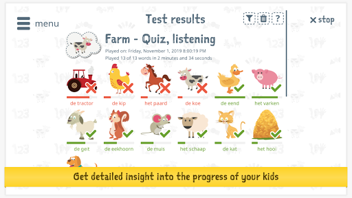 Listening and reading skills of children are measured by the app, and can be viewed by parents and supervisors. The results can be filtered by category and skill.