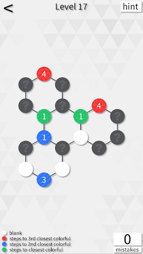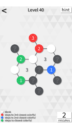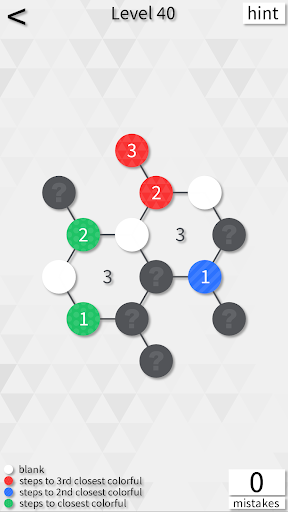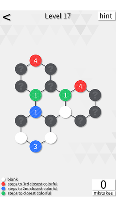 Your job is to guess if the hidden nodes are blank or colorful. A colorful node tells you how close either the 1st, 2nd, or 3rd closest colorful node is, depending on its color.