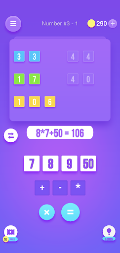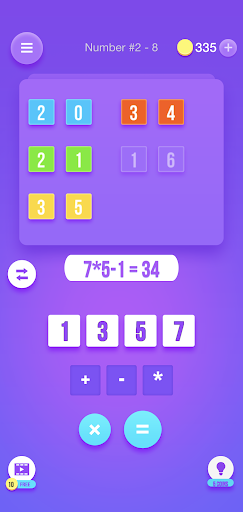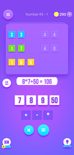 1 - Swipe Mode: Simply connect the numbers and math functions to form the correct equation to achieve the displayed target numbers.