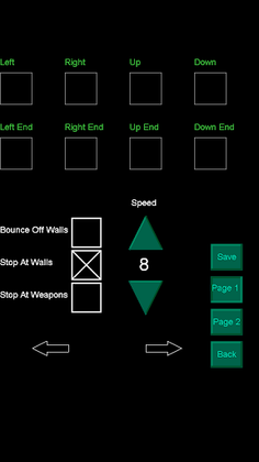 WeaponsWeapons of different types can be created. The effect of each weapon can be selected, from weaker types like knock back and disarm to stronger types like slow down, stun or destroy. Weapons can have different speeds and ranges too. Configure how the weapon will interact with walls, and other weapons. Choose whether the weapon will stop at a wall, bounce off, or is indestructible and will go through all walls and weapons.
