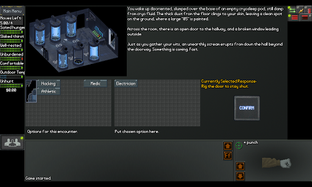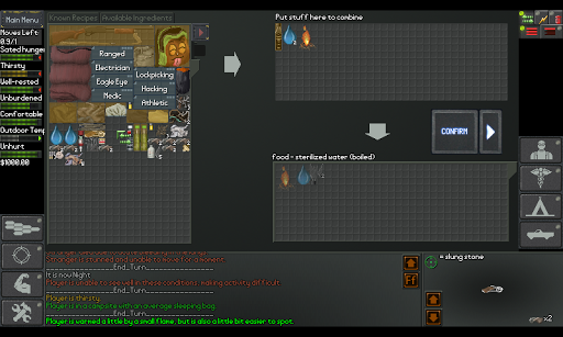 Choose abilities and flaws every time you play since different combos can unlock new abilities and quest lines. NEO Scavenger also has an extensive crafting system where you can substitute similar items. You can, for example, make a rifle scope from a pair of binoculars or a noise trap from a pill bottle and small rocks. Desperate combat is a thrilling aspect of the game, with many moves such as tackle, lure, kick while down, demand surrender, and threaten. You will experience realistic wounds and metabolism simulations, too. Creatures have multiple wound locations, and you must manage infections, bleeding, and pain. Everything is tracked, including hypothermia, fatigue, thirst, hunger, disease, intoxication, and shelter. Its complex inventory system with slots for carrying, wearing, containers, and more. Fit items in grid spaces, and manage encumbrance.