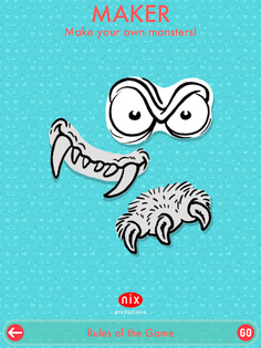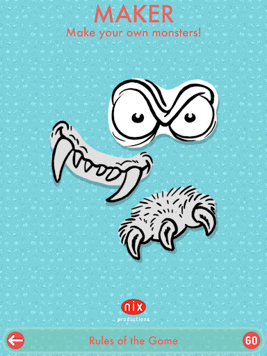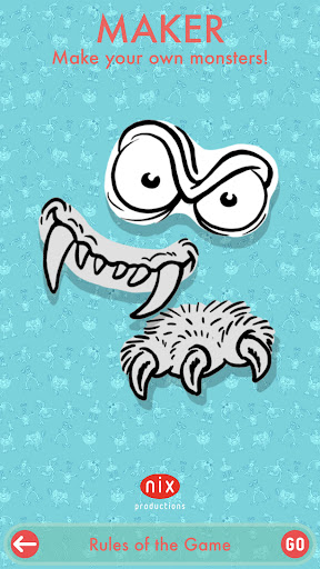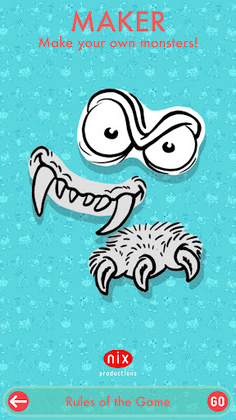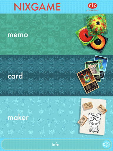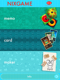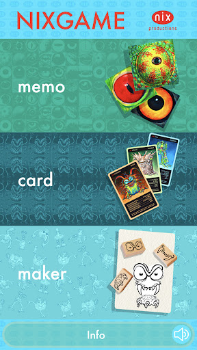 NIXGAME consists of three game types: the MEMO game, where you train your memory and attention, the CARD game, where you use strategy and luck to get to know many strange creatures, and the MAKER game, where you can build your own characters, put on backgrounds of your choice and get them to tell messages with texts and speech bubbles.