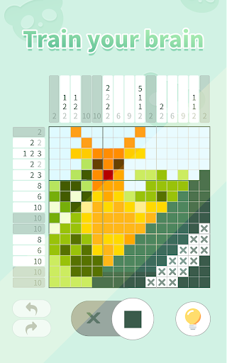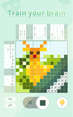 Nonograms are addictive brain games that combine logic with pixel art. Reveal hidden images on the puzzle pages based on the numbers lined up in both directions! Nonogram is a picture cross sudoku puzzle, you just need to follow the basic rules and logic to reveal the hidden picture. Squares on the board must be filled by number or left blank. Numbers show how many squares to fill. The numbers above the column are read from top-to-bottom. Numbers to the left of the rows are read from left-to-right. According to the numbers, color a square or mark it with an X. If you fill in all the right squares in this pic cross puzzle, you will uncover a lovely pixel art picture! This is the main point of the nonogram quiz.This entertaining mind game will bring you hours of fun!