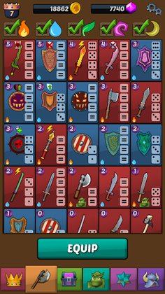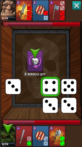 Choose to play as Orky Balboa, an orc Prince who has been banished from his home and must explore dungeons and collect a complete set of armor to earn his way back. Engage in unique turn-based battles where you roll the dice to match your orc's weapon dice and trigger attacks and defenses. Be strategic in your distribution of rolled dice across your armory, as your opponent will use the same dice to counterattack.