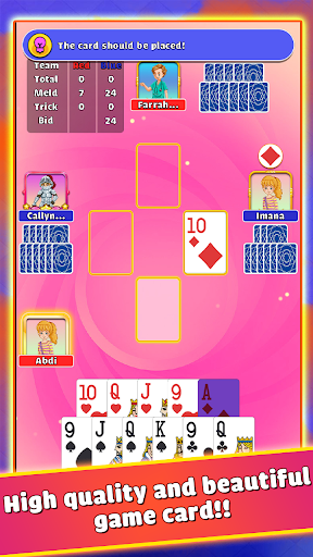 Pinochle Palace Card Game is a trick-taking and melding game popular in the United States. If you love to play classic card games, Rook card games, or Spoons card games like Canasta card game, bid whist, 400 arba3meyeh, tarneeb, Trix... Then Pinochle is the right card game for you and your friends and it's free.