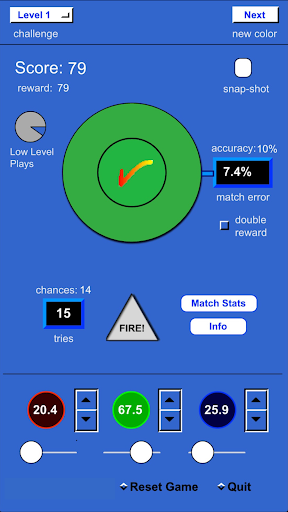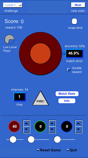 The object of the game is to find a reasonable match to the target color by determining what the three RGB intensities are within a limited number of tries. Each time one finds an acceptable match points are awarded. This might at first seem to be a trivial undertaking, however as the required accuracy of the match gets dialed in closer, it becomes an ever more difficult challenge, which demands a notable use of both left and right brain skills and abilities to find matches quick enough to score. We call this app a power play on color matching because, unlike some of the other really basic color matching apps out there, with this app you amp up the level of play. Then to come out with the highest score one needs a winning combination of both skills and tactics. The app is most suitable for ages 10 years old and up, although somewhat younger folks may be able to take on the challenges too.