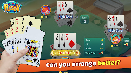 The rules of Pusoy are simple. Arrange the given 13 cards into three poker hands - two of five cards and one of three cards. But can you arrange it better? To outsmart your given cards and Pusoy the opponents!