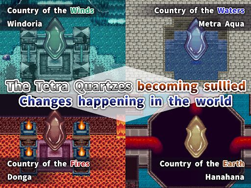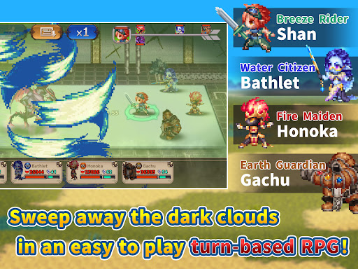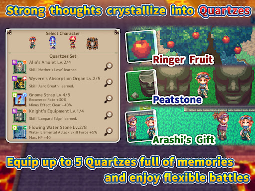 Soar on the breezes around the world in your flying Beakle, upgradable with parts to spread your accessible areas. Make use of the elementals not only in turn-based battles, but in dungeon gimmicks as well by combining character abilities. Find also the Quartzes to strengthen your party, acquire skills and techniques. Not to forget the entire world drawn with nostalgic pixel artworks!