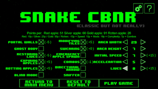Have fun on trying out many different game settings. Want to have more freedom? Increase the size of the area! Walls are scary? Turn them into portals! Speed feels wrong? Choose the other one! Never won a game of snake? Make tiny area and do it with ease for the first time! Normal playthrough is too easy? Try the blind mode!