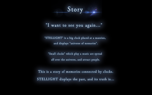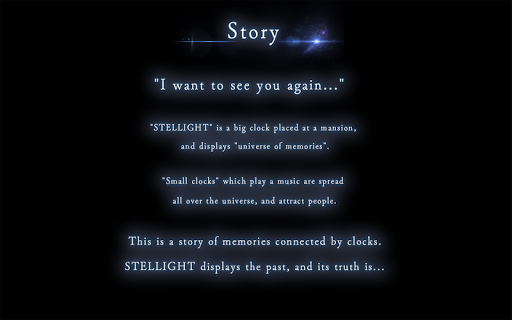 “I long to see you again…” echoes the voice, prompting a journey through memories that will connect you with the past. In a beautiful mansion, a majestic clock named “STELLIGHT” displays the “universe of memories”. Delicate “small clocks” spread throughout the universe guide the way as captivating melodies fill the air.