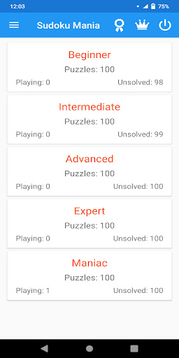 * 5 Difficulty Levels - Beginner, Intermediate, Advanced, Expert and Maniac, with 100 puzzles in each level.