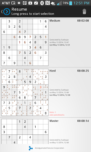- Each sudoku puzzle is auto-saved every time you leave the client and can be resumed later.