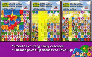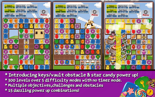 Players can also earn power-up candies by matching four or more candies. The three power-ups available in the game are candy jars (horizontal and vertical), double candies, and lollipops. Additionally, mystery items represented by wrapped candies can appear and either help or hinder the player's progress depending on their luck.