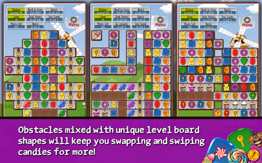 The game features two types of obstacles, cupcakes/chocolate blocks and netted candies. Cupcakes and chocolate blocks can't be moved but can be cleared if an adjacent match item is cleared, or if a candy jar or a double candy power-up is triggered. Netted candies cannot be swapped and can only be removed by matching them with two other candies of the same type or by triggering a power-up chain.
