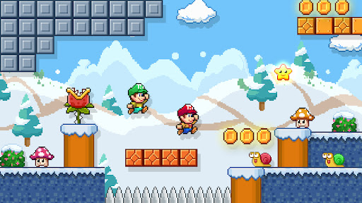 In Super Robby Bros : Jump world, you will travel through different worlds that are filled with unique challenges and obstacles. You will explore a variety of environments such as forests, deserts, and mountains. You can collect coins and power-ups along the way to help you in your journey. Each world has its own set of enemies and bosses that you need to defeat to progress through the game.
