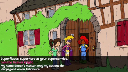 In the tranquil French village of Fochougny resides the wealthy Harpagon Lonion who, in a peaceful countryside setting, dons the persona of the ineffectual superhero Superfluous. Alongside his aide Sophie, who attempts to quell her employer's overzealous enthusiasm, you will join in the investigation to unmask the anonymous apple-pilferer, who wreaks havoc amongst the village orchards.