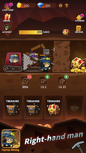 Tap the screen mining area with your finger, the miners start to work, and you can get the treasure chest by digging the rock formation blocking the treasure chest. Due to the thick rock formation, the miners will be tired all the way down. We can invite large machines, which can quickly dig through the rock formation. Our ultimate goal is a treasure chest, so all those who can work with machines use machines to strive for the fastest Get the treasure chest.