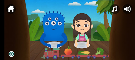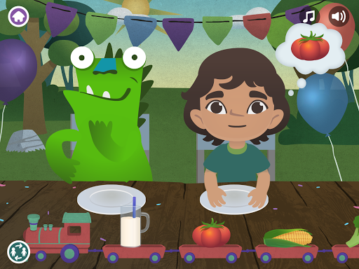 Players feed various foods to different characters, placing the new food items on their plates and seeing their reactions.