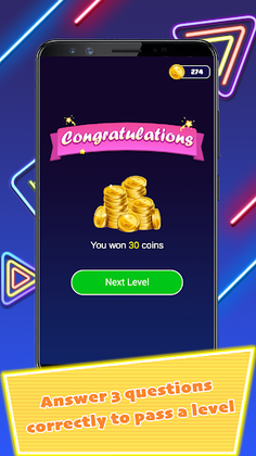 ► Answer 3 questions correctly to pass a level.