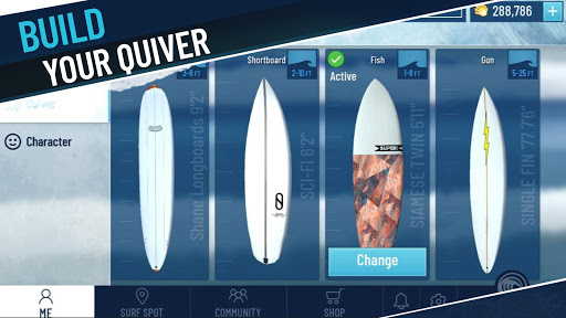 With True Surf, you can become a surfing legend by building your quiver with shortboards, funboards, longboards, guns, and fish, according to wave conditions. As you progress through your career, unlock new boards for purchase.