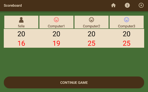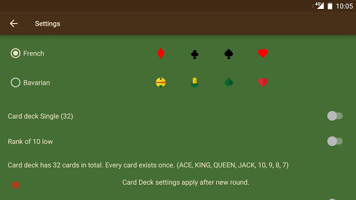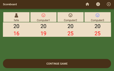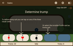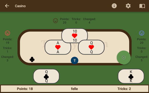 Initially, every player receives three cards. The lucky player who receives the blue trump icon will define the trump suit according to the first three cards. If not, they have the option to select the fourth card as the trump suit. Following this, each player may exchange as many cards as they want before the game commences. Once the card exchange has been completed, the person who selected the Trump suit will lead the way. Players must follow suit, with the winner of each round beginning the next. The game moves in a clockwise direction.