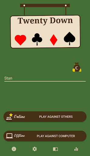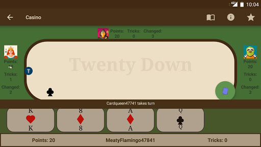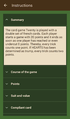 Twenty Down: a card game where players start with 20 points and count tricks; the player first to have zero points wins. Trumps and exchanges involved.