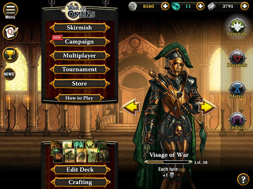 Play as the rich and ancient Vespitole, the ruthless and savage Daramek, the mysterious society known as Metris, or the reclusive and powerful Endazu. Each faction has their own heroes, their own cards, and their own unique play style. Unlock over 20 different heroes as you navigate the dark fantasy world of WAR OF OMENS®.