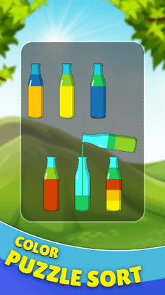 Best free to play water sort puzzle game's bottles have different color water layered on top of each other, the game is about to sort each color on a single botol to complete the level.