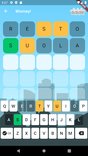 Worney is a game where you have to guess a secret word by following four simple rules:- every attempt must be a meaningful word;- each letter not present in the word to guess is colored black;- each letter in the word to be guessed in the right position is colored green;- each letter present in the word to be guessed but not in the right position is colored yellow;