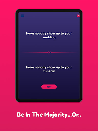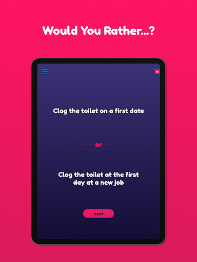 Play through hundreds (400+) of fun, embarrassing, and intriguing questions, and find out which scenarios your friends and close ones prefer! Spice up your parties by making it competitive!